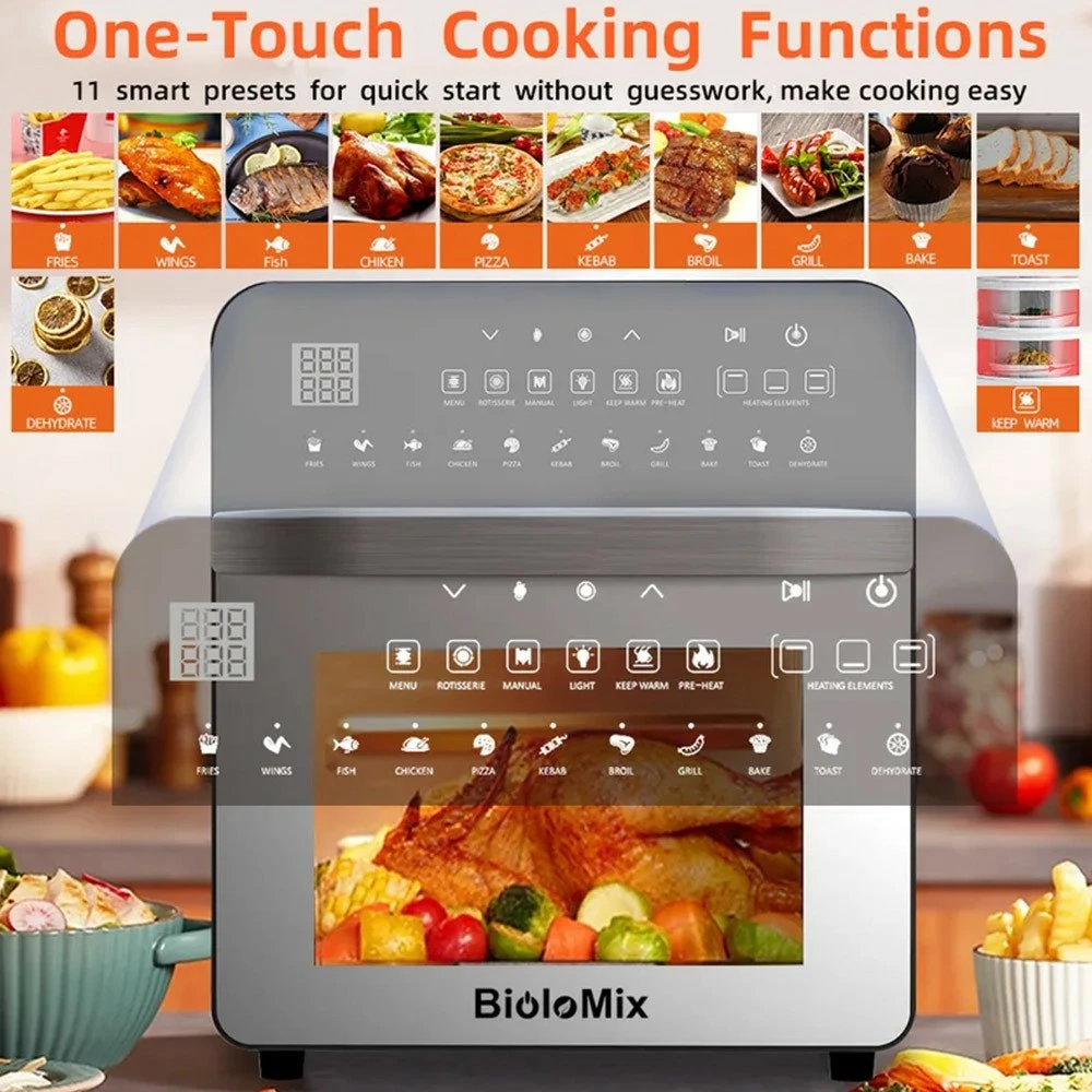 Equipped with a sensitive touchscreen and intuitive icons, this digital air fryer oven is easy to use even with wet fingertips. 11 intelligent presets for a quick start, make cooking easy and beginner-friendly. The timer and temperature can be customized to your desired temperature (50-220 Celsius) and time (0-120mins).