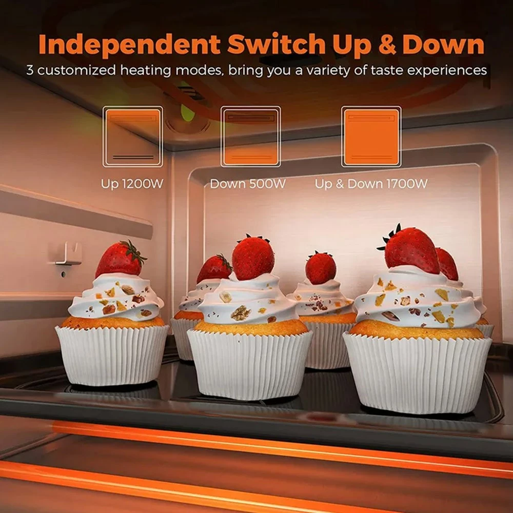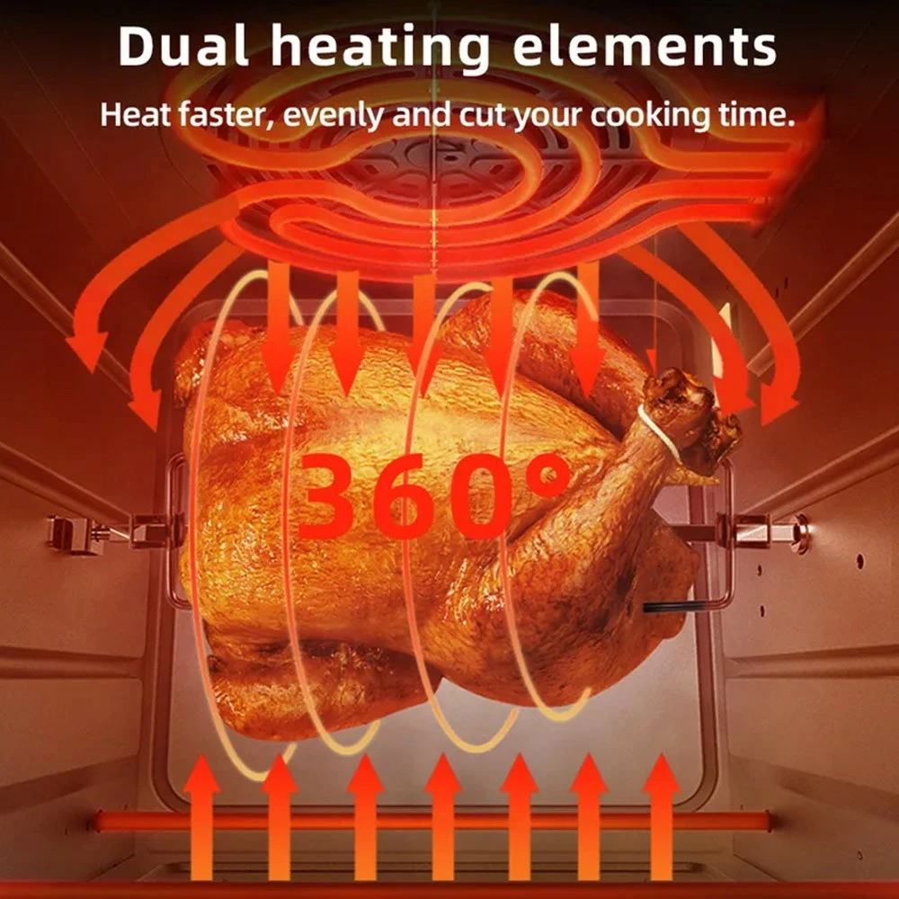 Up and down heating elements combined with 360-degree hot air circulation make the temperature up to 220 Celsius, which can cook flavorful family-friendly meals by cutting off 30% of cooking time and making the ingredients evenly with juicy crunch. In addition, the up and down heating elements can be independently switched.