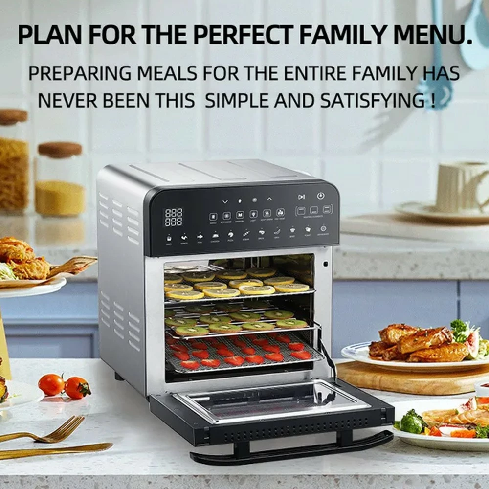 15L family-size oven is easy to prepare a big meal for up to 8 people. 3 separate tiers design makes frying up the main course and side dish all at once possible.