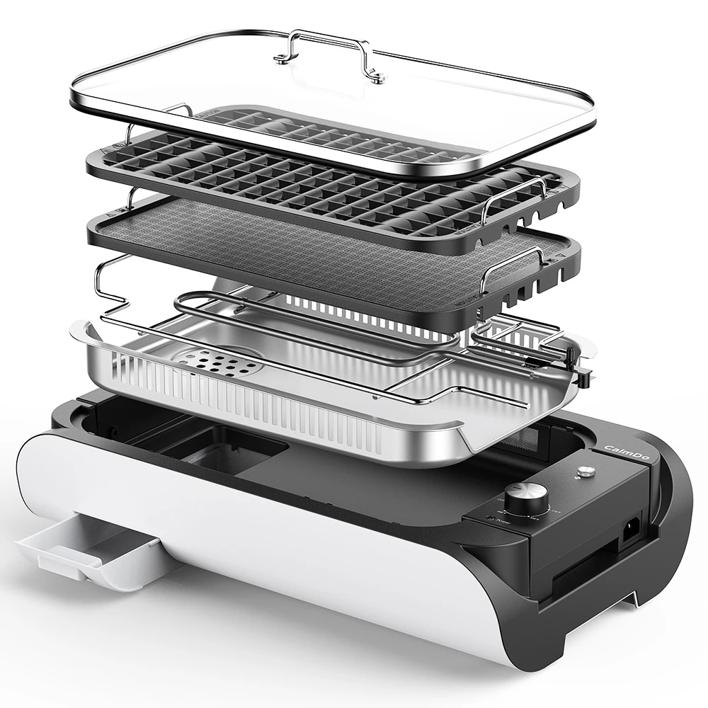 Using airflow technology and a smoke-catching fan, the CalmDo Electric Smokeless Grill quickly reduces annoying smoke and odors by 90% while maintaining the authentic taste of a charcoal grill.