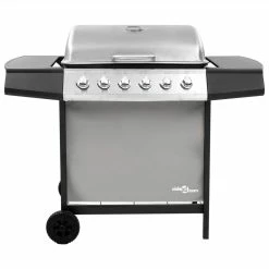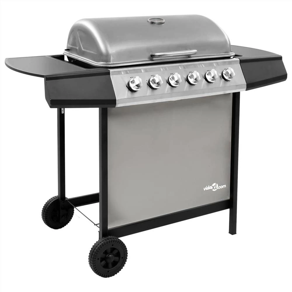 This gas BBQ grill, with 6 burners, is ideal for creating an outdoor feast for your family and friends. It will make your outdoor cooking experience sizzle, effectively turning your backyard into a second kitchen! The gas grill features a stylish and functional design. It has a large cooking surface and a heavy-duty hood with a built-in thermometer which accurately displays the cooking temperature. Side tables offer additional workspace for making sauces or your favourite side dishes. A removable grease drip container is also included, which is easy to clean. Made of heavy-duty materials, the grill is very durable. The shelf underneath provides large space to store cookware and utensils. Thanks to the 2 sturdy castors, the grill is easy to move around. Delivery also includes a BBQ cover to protect the grill from rain and dust. To connect the barbecue to the gas cylinder, a gas hose and a proper pressure regulator are required, which are not included in delivery.