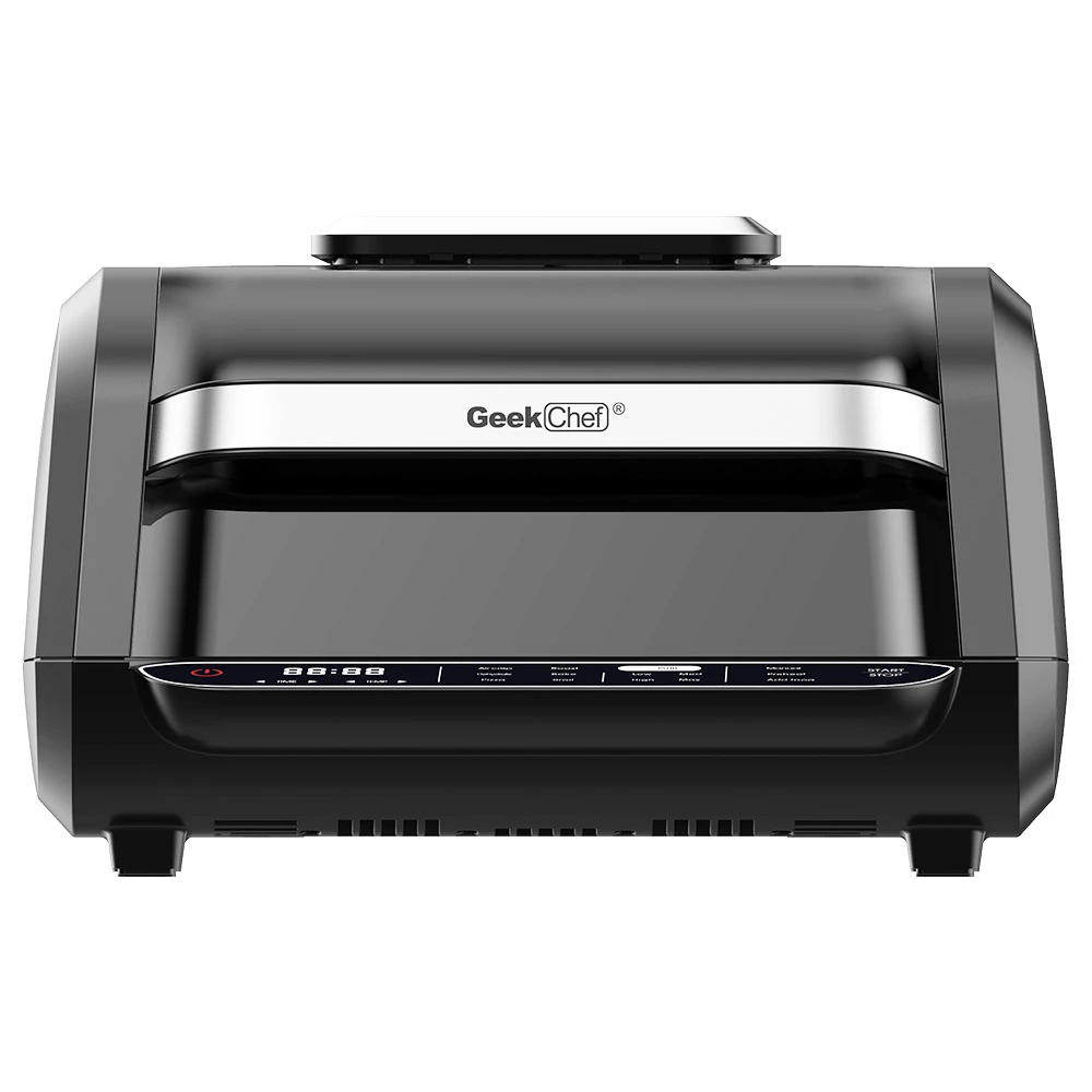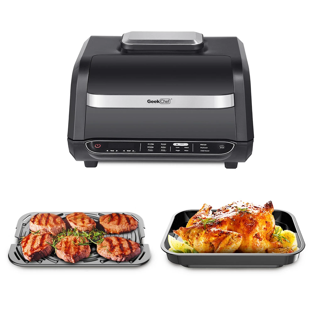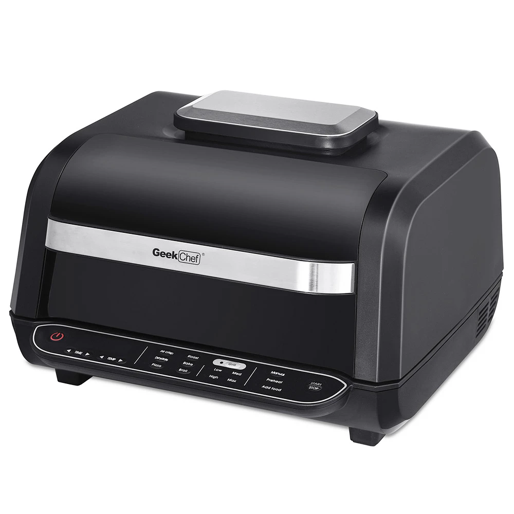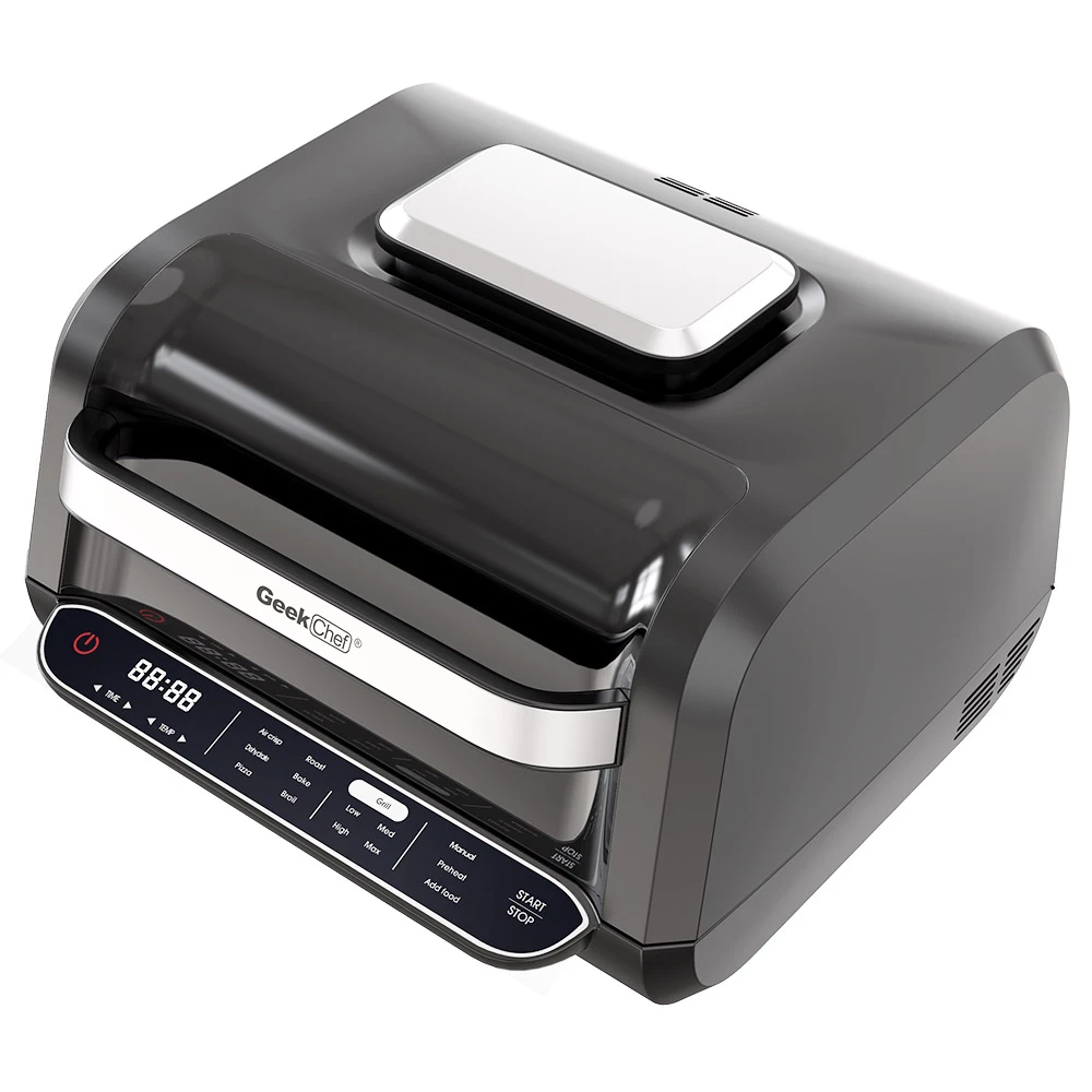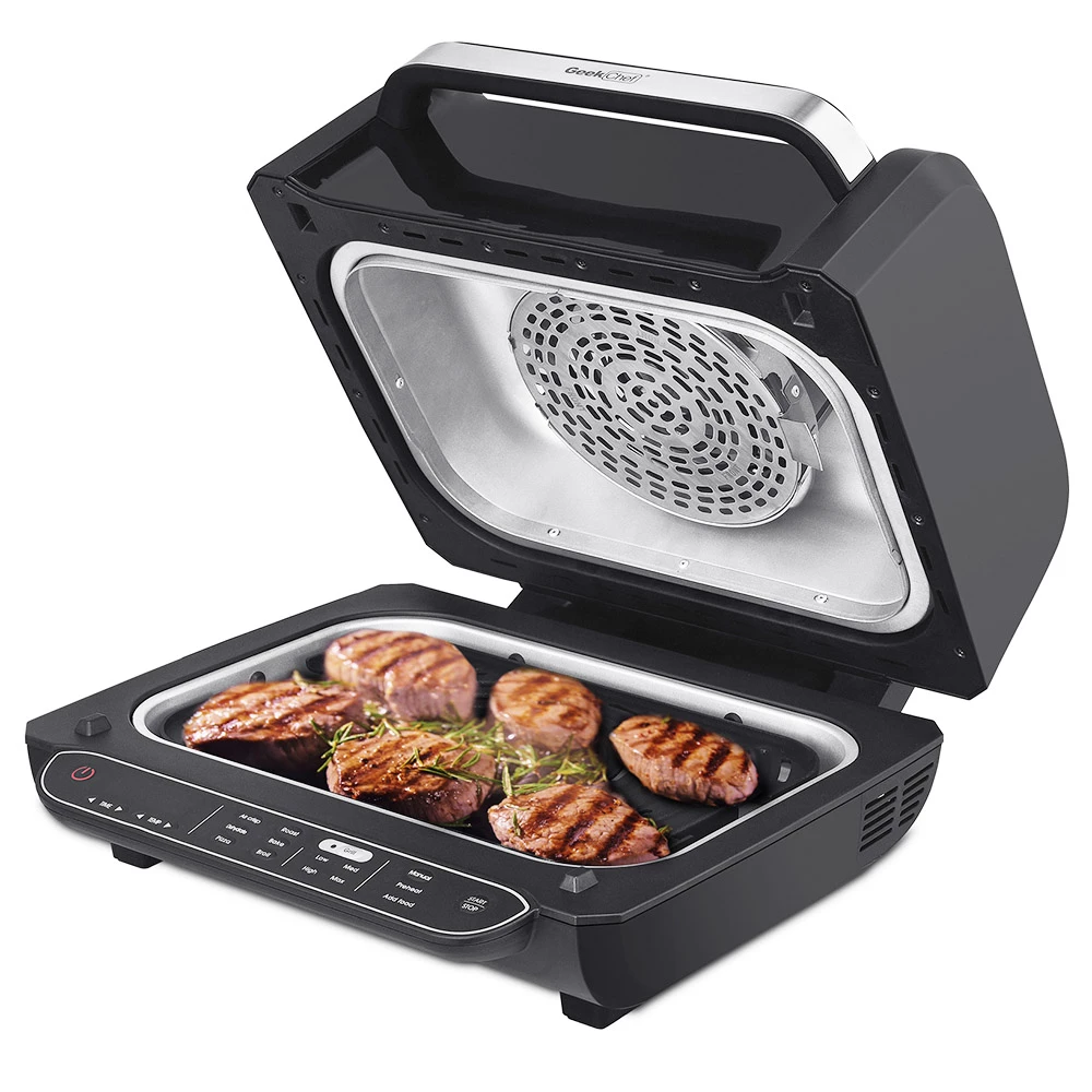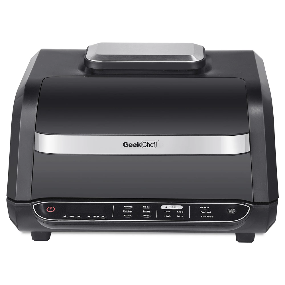Equivalent to an indoor electric grill with smart cook System. Grill your favorite food to the perfect food,it has 7 excellent cooking functions: Grill, Air Crisp, Bake, Roast, Broil, Pizza and Dehydrate.