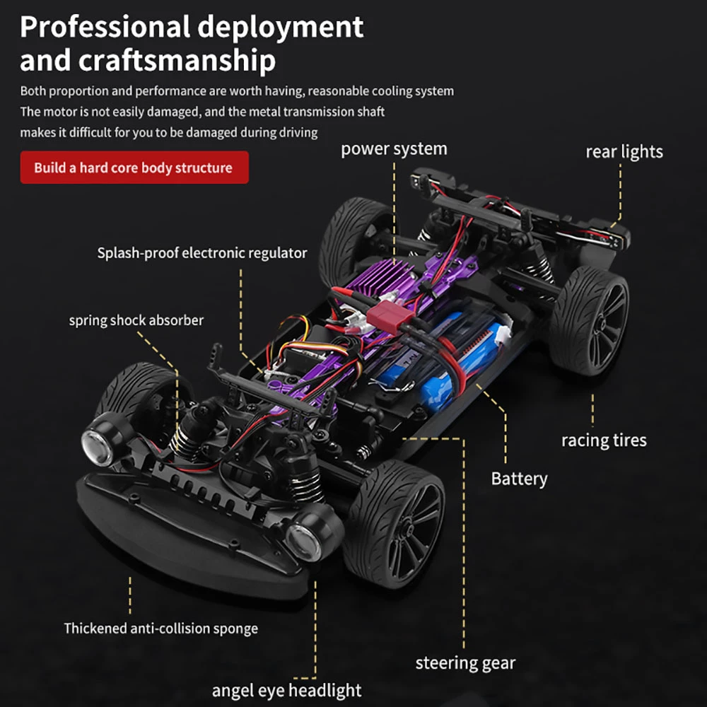 1. The simulation structure design is adopted, which has the control feeling of a real car, and realizes full-scale continuously variable transmission, high-speed driving, rapid acceleration, deceleration, braking, reversing, left turn, right turn, and drift