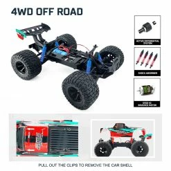 2.4GHz full-function proportional radio control system suffices a stable control range within 100m.Reliable transmission forward/reverse, turn left or right, steer, drift and brake would never fail. Splash waterproof electronic components make an all-terrain vehicle out of this truck. No worries to run this remote control cars on grassland , sands, and bumpy grounds.