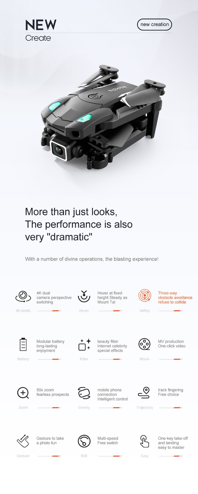 One Key Obstacle Avoidance, Forward, Backward, Left turn, Right turn, Up, Down, Side Fly, One Key Take-Off, One Key Landing, 3D Flip, Headless Mode, Speed Adjustable, WiFi Transmission, 50 Times Zoom, Gesture Photography, Gesture MV Shooting, Motion Sensor, Track Flig
