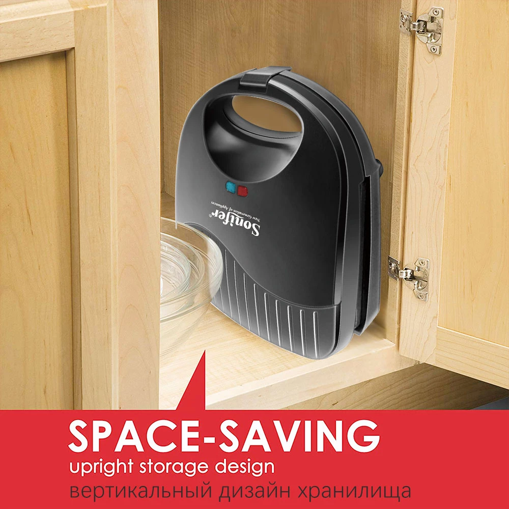 With a comfortable handle, foldable design, and built-In cord wrap space, this waffle maker can be easily stored in your cupboard.
