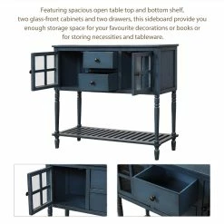 Featuring a spacious open tabletop and bottom shelf, two glass-front cabinets, and two drawers, this sideboard provides you enough storage space for your favorite decorations or books or for storing necessities and tableware.
